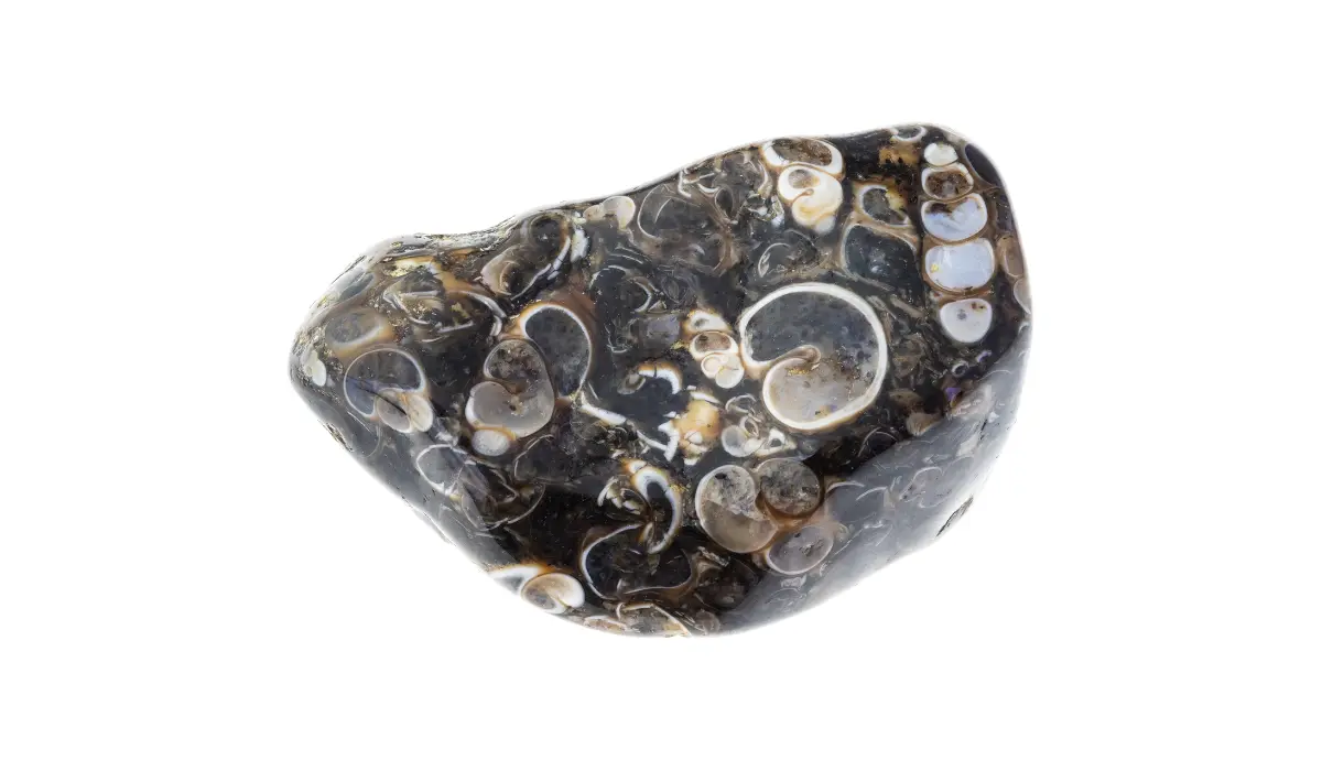 On confond souvent l’agate fossile avec l’agate turritelle. Pourtant, cette dernière est une variété spécifique, formée principalement à partir de fossiles de gastéropodes spiralés appelés Elimia. Ces coquilles, jadis considérées comme des Turritella, ont donné leur nom à la pierre. L’agate turritelle appartient donc à la grande famille des agates fossiles, mais se distingue par la beauté graphique de ses spirales brunes et crème.