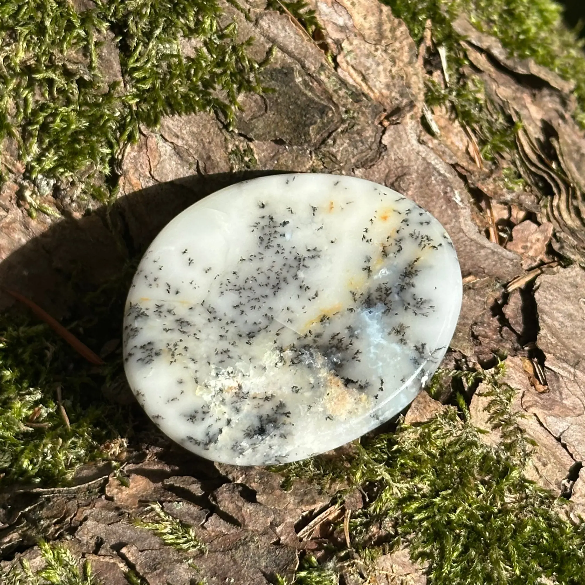 L’agate dendritique se forme dans les cavités de roches volcaniques ou sédimentaires lorsque la silice se cristallise lentement. Les inclusions sombres qui traversent sa structure sont composées de manganèse ou de fer, dessinant de délicates formes arborescentes. Ces dendrites rappellent les branches d’un arbre, reliant symboliquement l’homme à la nature et à ses cycles.