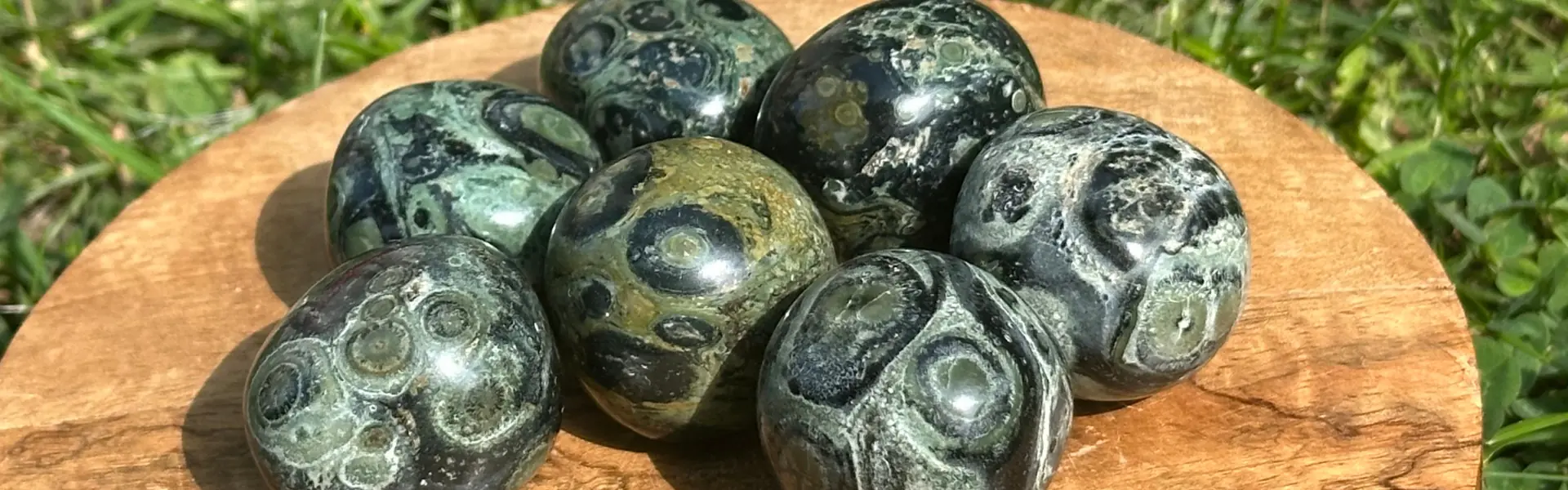 Le jaspe kambaba, ou jaspe crocodile, fascine par ses motifs tourbillonnants et ses teintes vertes profondes. Originaire de Madagascar et d’Afrique du Sud, cette pierre est souvent associée à la sagesse ancienne et aux énergies de la Terre. On raconte qu’elle contient la mémoire des premières formes de vie, car elle serait composée de fossiles de stromatolites, des algues primitives. Dans les traditions chamaniques, elle était utilisée pour calmer l’esprit, se connecter aux forces naturelles et recevoir les messages des ancêtres. Pierre de paix et d’ancrage, elle inspire stabilité et introspection.